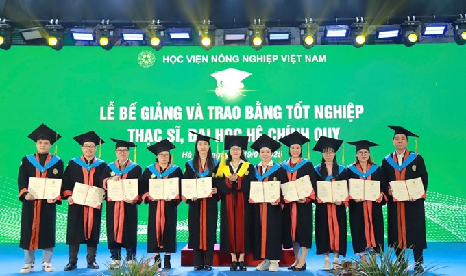 GS.TS. Nguyễn Thị Lan - Bí thư Đảng ủy, Giám đốc Học viện trao bằng tốt nghiệp cho các tân thạc sĩ.